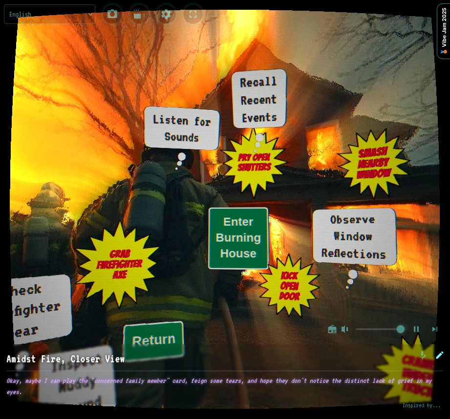 View the world as a single eyeball. * Infinite story branches. * AI panoramas, choices and storyline. * Extensive soundtrack (150+songs) * Custom Story (Tell a Story) Bubble * AI Text-to-speech * Image Analysis * Right-drag AI zoom! Note: Press Tilda (~) or click the location name to enter custom commands! #vapor #game #cyoa [☕]